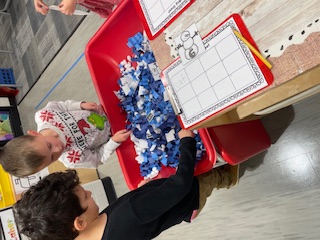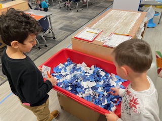 Sarah Grabemeyer in the Bumblebee Room noted those fine motor opportunities in her classroom as the sensory materials are being incorporated into workshop times. Her students also identify rhymes, stretch out CVC words, and match them to the corresponding pictures. She wrote,